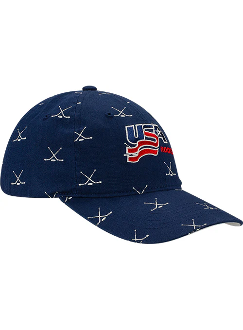 Gear up to cheer on USA Hockey with this Cross Sticks Pattern Adjustable Hat! This unstructured design is made of a casual garment washed cotton twill fabrication and features an all over printed cross sticks pattern and embroidered USA Hockey logo across the front panels.